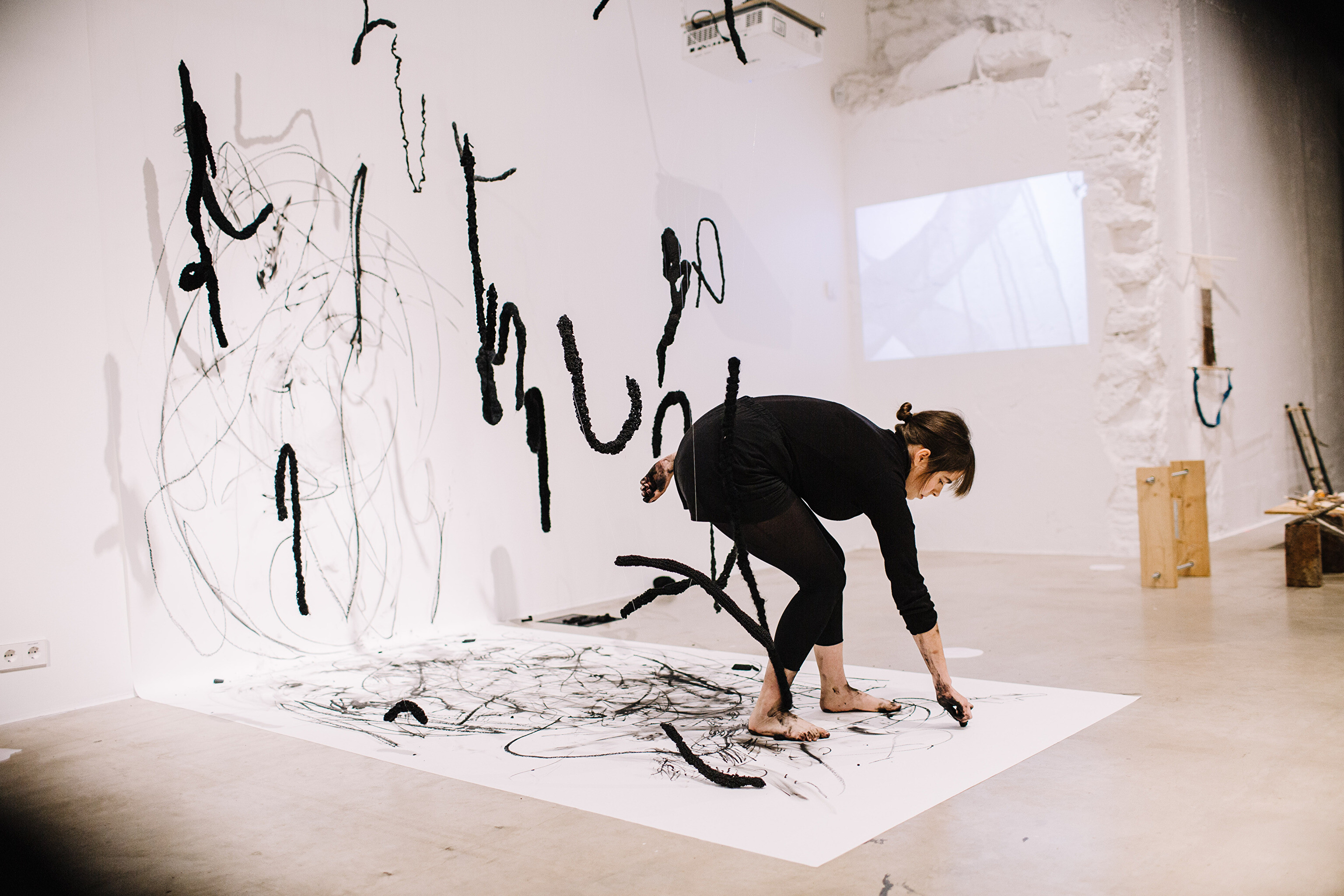 More than being an action, drawing results from an action: the trace of a moving body, the intermediate dimension between the inside (drawer) and the outside (tangible world). By drawing the line, I seek to create a place in which space, line and body conflate. Thus enabling the materialization of my personal trace and generating an encounter between the textile, drawing and performance fields.